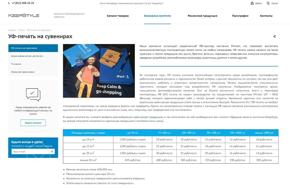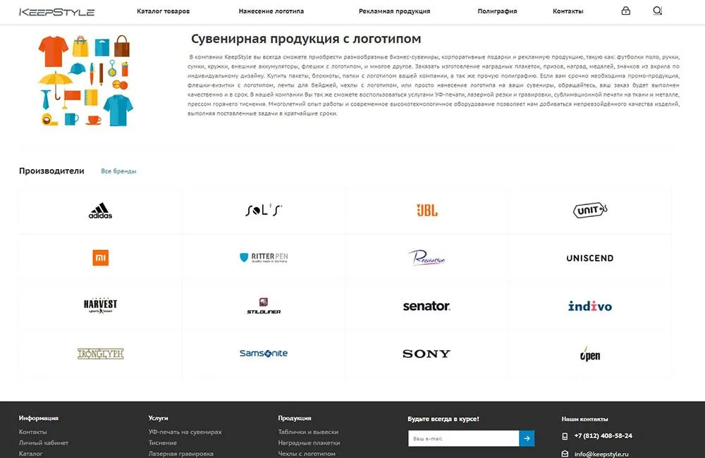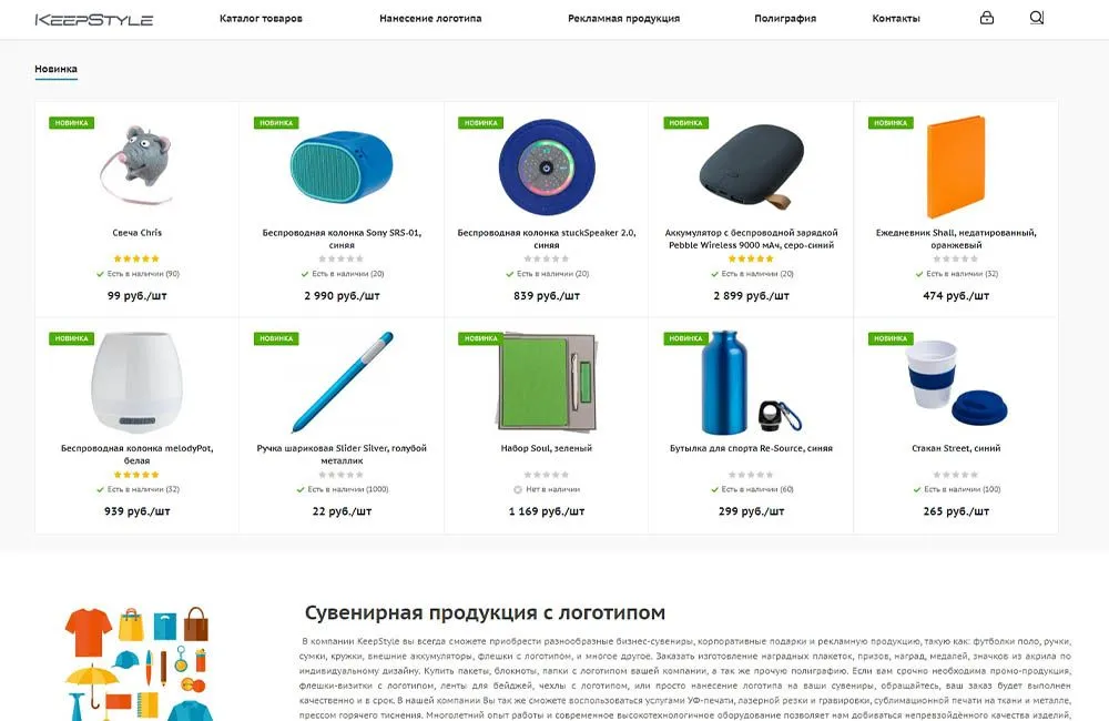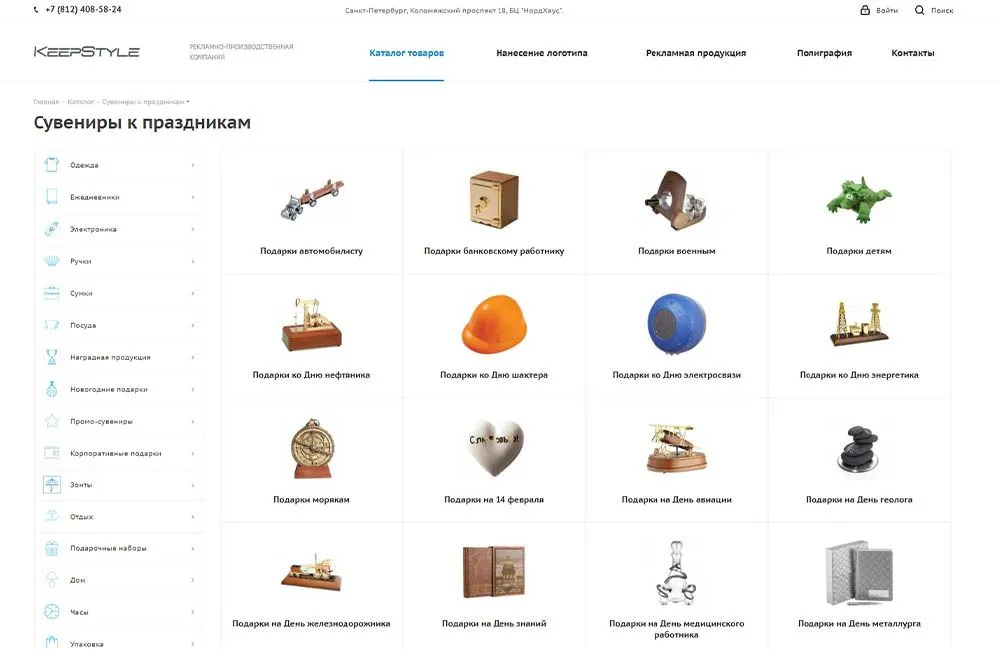 Компания KeepStyle занимается изготовлением сувенирной продукции и подарков, ориентирована на корпоративных клиентов. За месяц под ключ сдали проект и запустили рекламную кампанию. Мы проанализировали конкурентов, подобрали лицензию и готовое решение. Доработали дизайн сайта, выполнили работы по внутренней оптимизации. Сайт подключен к поставщику Gifts.ru (Проект 111) по Api. Доработано оформление заказа для возможности заказчику прикрепить свой логотип к заказу. Клиент получил готовый интернет-магазин сувенирной продукции с широким функционалом и отличными данными для дальнейшего продвижения.